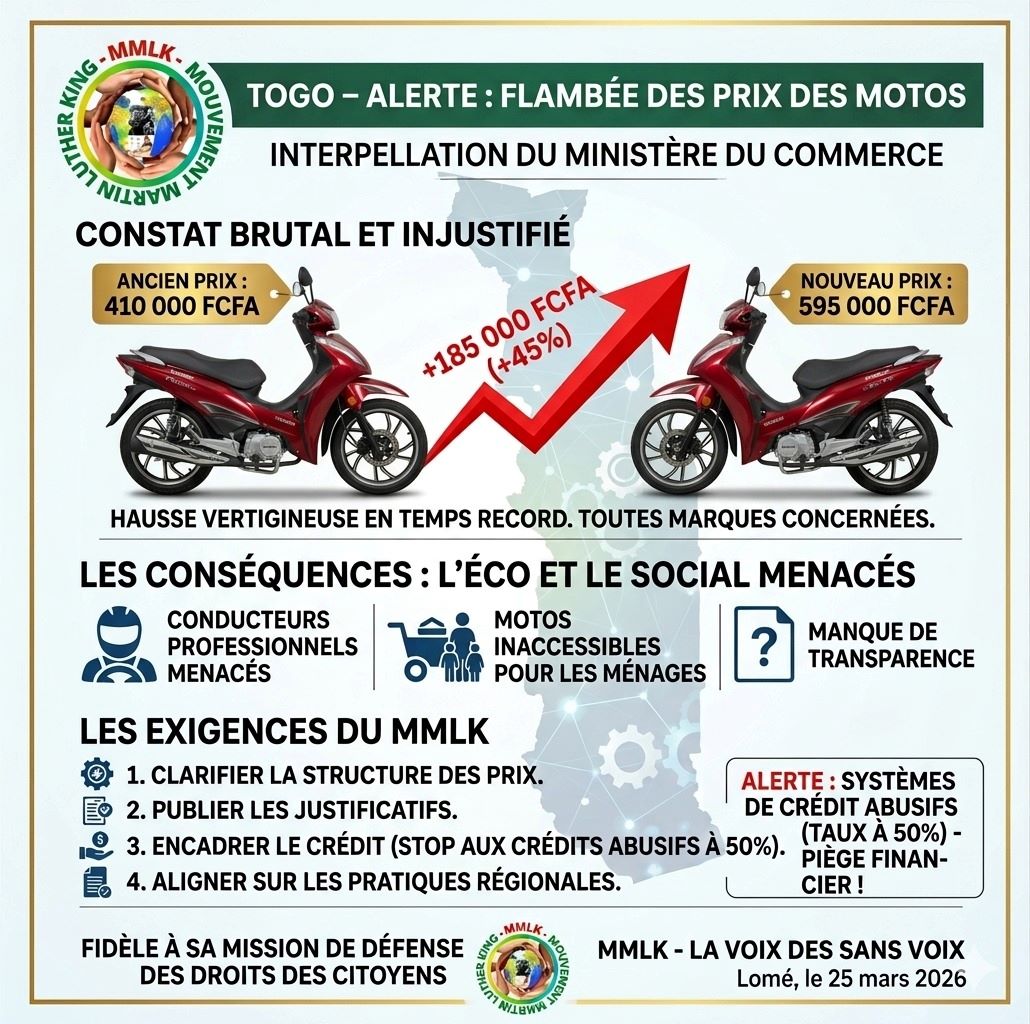 Le Mouvement Martin Luther King (MMLK), fidèle à sa mission de défense des droits des consommateurs et de veille citoyenne, tire la sonnette d’alarme face à la flambée inexpliquée des prix des motos constatée depuis plusieurs semaines sur le marché togolais.